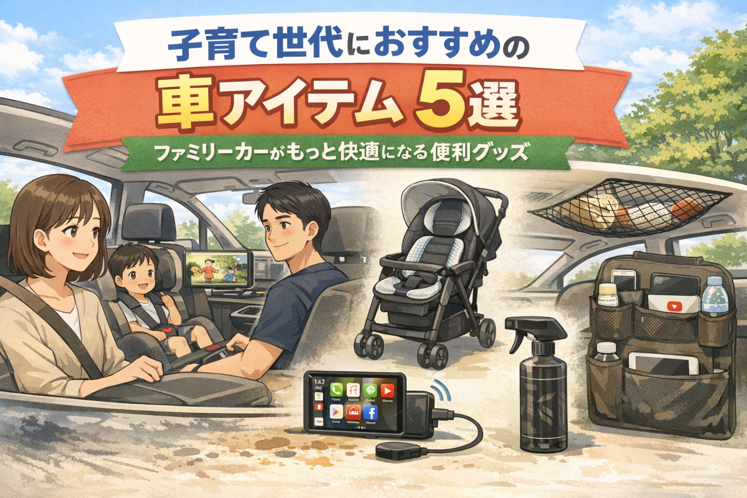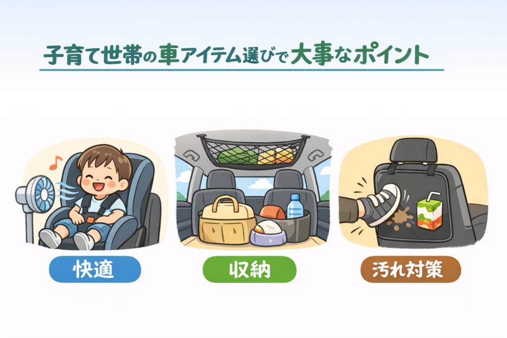 結論から言うと、子育て世帯の車アイテムは「快適・収納・汚れ対策」の3つが重要です。