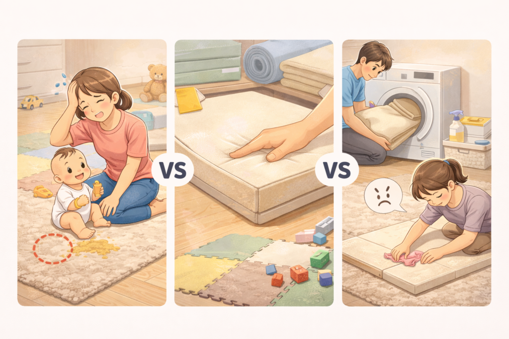 A. 掃除のラクさと汚れ耐性を考えると、折りたたみプレイマットが一番無難です。